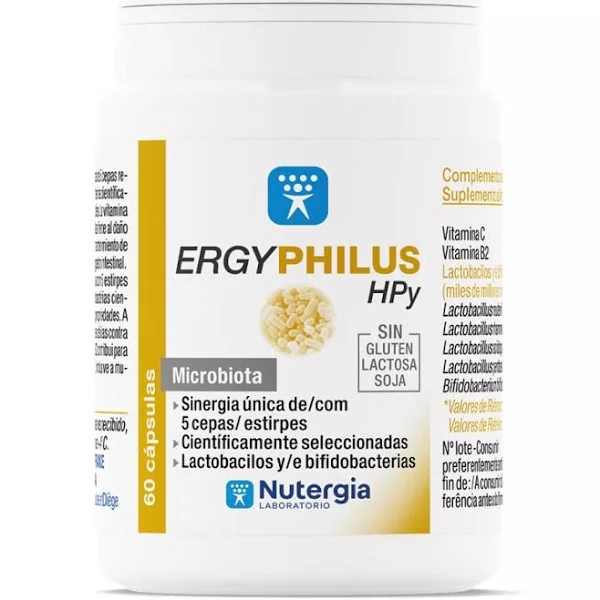 ERGYPHILUS® HPY es una sinergia única de lactobacilos y bifidobacterias científicamente seleccionadas por sus propiedades, de vitamina C y de vitamina B2 , que contribuyen al equilibrio de la microbiota gastro intestinal, especialmente en caso de: