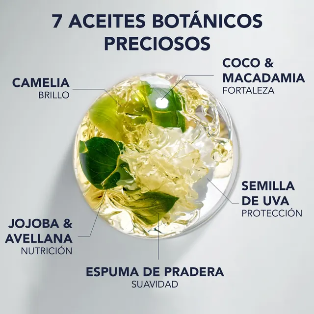 Una fórmula de uso múltiple enriquecida con 7 aceites botánicos preciados: camelia, jojoba, avellana, coco, macadamia, pepita de uva y