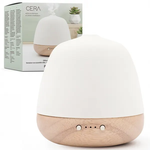 Con el fin de crear un difusor de aceites esenciales con una bonita estética, se han seleccionado materiales nobles y naturales: madera del árbol del caucho con un acabado claro de excelente calidad, y cerámica granulada para la parte superior.