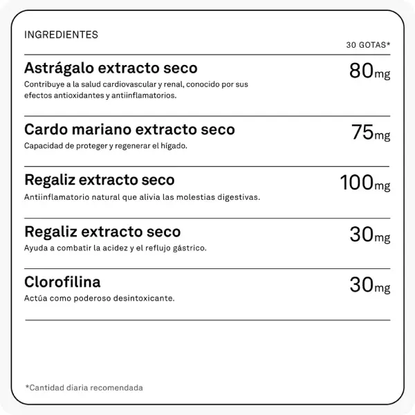 cardo mariano, regaliz y clorofilina, ingredientes que han demostrado ayudar a la detoxificación natural del organismo y brindar una protección extra contra las toxinas.