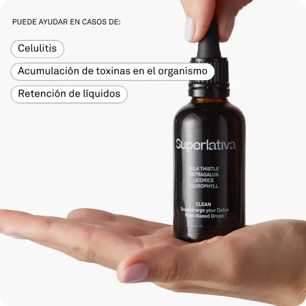 Clean es un producto detox que se presenta en formato gotero y que está formulado con una mezcla purificadora de ingredientes herbales que incluye astrágalo,
